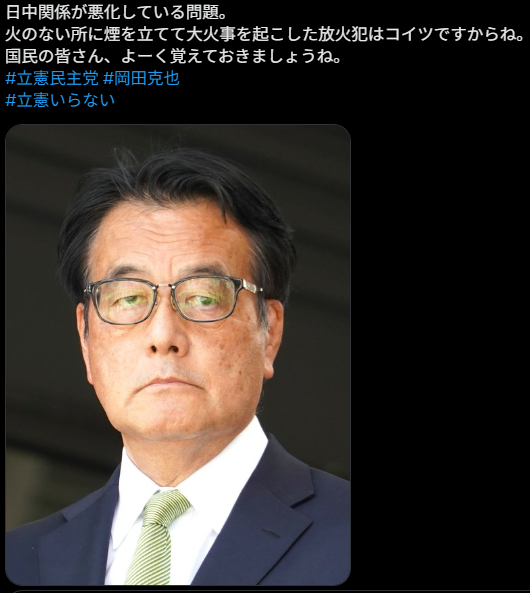 最後は政治の話題です。皆さん、現高市政権に中国を巻き込んで混乱を起こさせているのは下の人物です。そう、立憲民主党の岡田です。ばりばりの親中議員です。スパイ防止法を一刻も早く成立させてください。そして、三重3区の皆さん、こんな人を選んだ罪は重いと思いますよ。次の選挙ではしっかりと考えて投票してください。